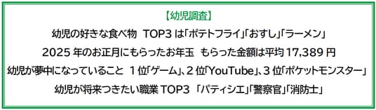2025年12月に、お年玉や起床・就寝時刻、好きな食べ物など、小学生・中学生・高校生の日常生活に関する調査結果を発表しましたが、今回はこれらに続き、悩んでいることや将来の職業などに関する小学生・中学生・高校生の調査結果に、幼児の起床・就寝時刻や好きな食べ物といった、日常生活に関する調査結果を追加して公開したものです。