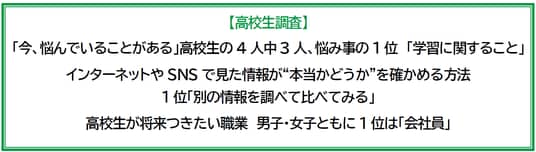 ■調査結果からの提言今回は小学生・中学生・高校生の3校種に加え、今回新たに幼児を対象とした調査を実施しました。それぞれの校種での特徴を比べてみていただければと思います。また「将来つきたい職業」など、いくつかの項目では、選択肢ではなく、自由回答で、子どもたちの声を聞く形にしました。子どもたちが、今をどう捉え、未来に何を見ているのかを感じとっていただければと思います。