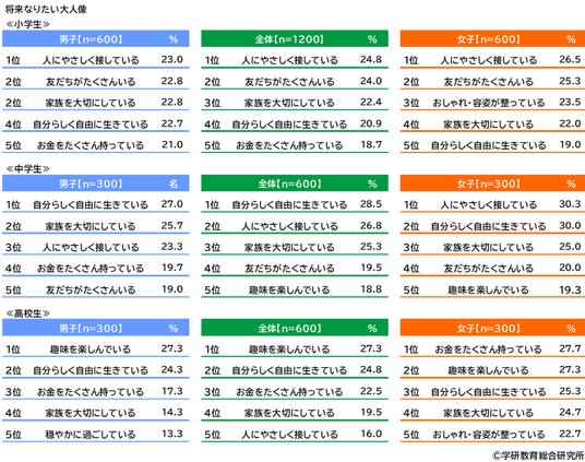 将来、どのような大人になりたいと思っているかをきいたところ、小学生では、1位は「人にやさしく接している」(24.8%)でした。次いで、2位「友だちがたくさんいる」(24.0%)、3位「家族を大切にしている」(22.4%)、4位「自分らしく自由に生きている」(20.9%)、5位「お金をたくさん持っている」(18.7%)となりました。