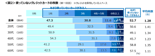 使っていないクレジットカードの平均枚数は1.28枚。「1枚」は30.8%、「2枚」は11.6%。<図2>