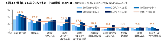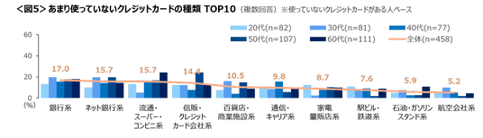 特に60代で「流通・スーパー・コンビニ系」、50代で「信販・クレジットカード会社系」のクレジットカードが使われていない。<図5>