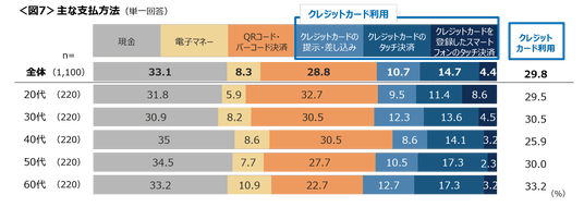 クレジットカードでは「タッチ決済」が最も利用されていて、年代があがるほど利用率が高い。「QRコード」は年代が低いほど利用されている。<図7>