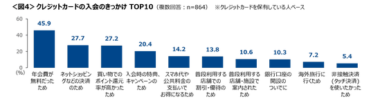 クレジットカードの入会のきっかけは「年会費無料」が45.9%。次いで、「ネットショッピングなどの決済のため」「買い物でのポイント還元率が高かったため」が上位。<図4>
