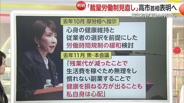これまでの高市首相の働き方への考え方を見ると、首相就任後の2025年10月、厚生労働大臣に、心身の健康維持と従業者の選択を前提にした労働時間規制の緩和の検討を行うことについて指示、さらに2025年11月の国会では、「残業代が減ったことで、生活費を稼ぐために無理をして慣れない副業をすることで健康を損ねる方が出ることも、私自身は心配をしている」と、働き方改革による労働時間を規制することで生じる弊害について懸念を示していた。