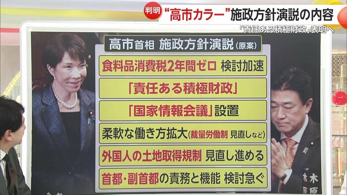 20日に行われる施政方針演説では、食料品消費税2年間ゼロの検討加速、責任ある積極財政、国家情報会議の設置、裁量労働制の見直しなど柔軟な働き方の拡大、外国人による土地取得規制の見直しを進めること、首都・副首都の責務と機能に関する検討を急ぐことに関して演説する見通しだ。