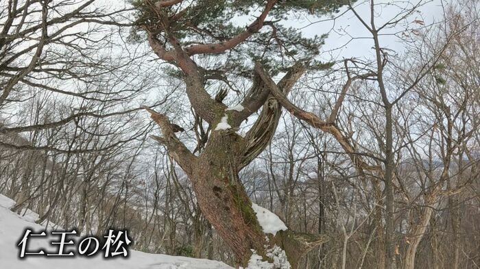 木立の中を、雪を踏みしめ登る事一時間、立派な枝ぶりの「仁王の松」が現れた。