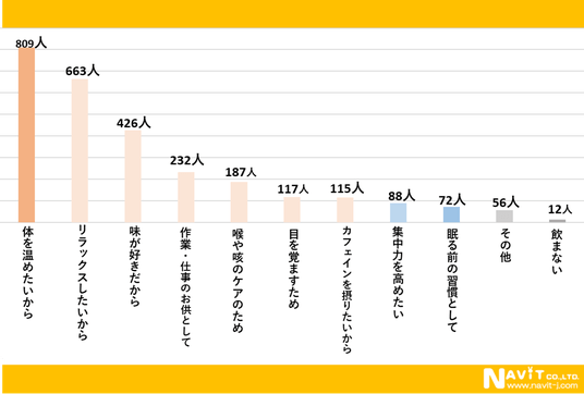 温かい飲み物を飲む理由について複数選択可で質問したところ、「体を温めたいから」が809人、「リラックスしたいから」が663人、「味が好きだから」が426人という順になりました。