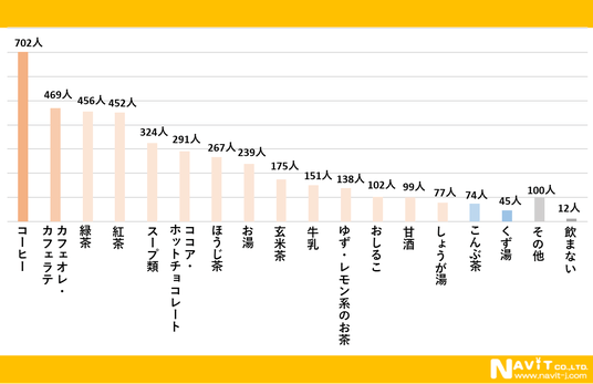 「よく飲む温かい飲み物は何ですか?」という質問を複数選択可で行ったところ、「コーヒー」が702人、「カフェオレ・カフェラテ」が469人、「緑茶」が456人という順になりました。