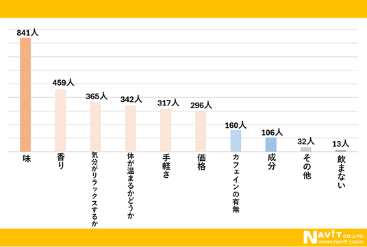 温かい飲み物を選ぶときに重視するポイントについて複数選択可で質問したところ、「味」が841人、「香り」が459人、「気分がリラックスするか」が365人と続きました。