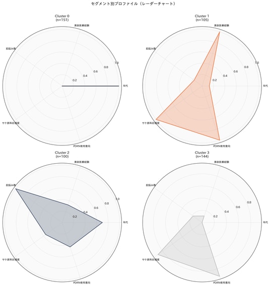 年代・美容医療経験・肌悩み数・サケ原料好感度・PDRN使用意向の5変数を用いたK-Meansクラスター分析の結果、消費者は4つのセグメントに分類されました。