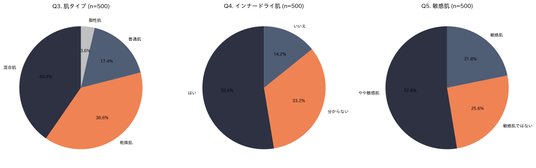 回答者の86.6%が女性、年代は30代が35.8%で最多、次いで40代が26.4%。肌タイプは乾燥肌(36.6%)と混合肌(27.6%)が多数派を占め、「やや敏感肌」以上を自覚する人は全体の65%に達しました。