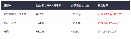 11項目の肌悩みとPDRN興味の関連をそれぞれ検定した結果、統計的に有意な正の関連が確認されたのは以下の3項目でした。