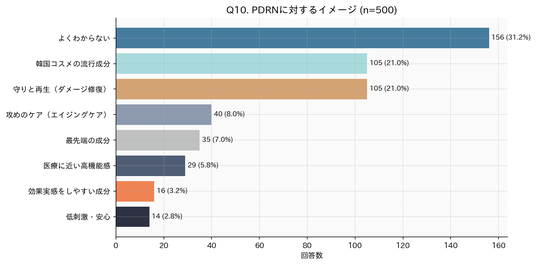 PDRNに対するイメージでは「よくわからない」が29.0%で最多。一方、「守りと再生(ダメージ修復)」「攻めのケア(エイジングケア)」など具体的なイメージを持つ層も合計で約40%に上りました。