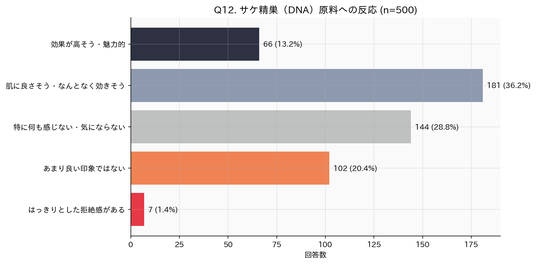 PDRNの原料がサケの精巣(DNA)であることについて、「効果が高そう・魅力的」と「肌に良さそう」の合計が51.0%。「あまり良い印象ではない」「拒絶感がある」は合計10.6%にとどまり、天然由来原料としての訴求は概ね受け入れられることがわかりました。