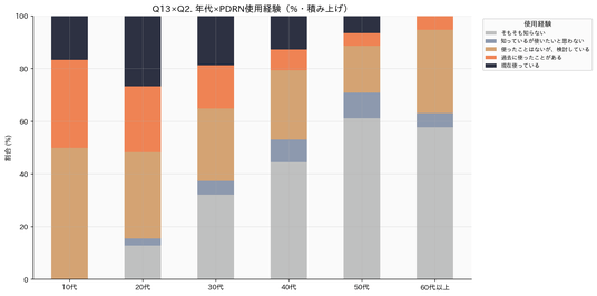 年代別に見ると、20代の「現在使用中」率が22.2%と全年代で最も高い一方、50代以上では「そもそも知らない」が過半数を超えました(カイ二乗検定 χ²=82.27, p<.001)。PDRNの認知は年代によって大きく異なります。