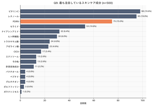 最も注目しているスキンケア成分を単一回答で聞いたところ、1位はビタミンC(17.4%)、2位レチノール(14.2%)、3位セラミド(10.4%)。PDRNは第4位(9.8%)に入り、全17成分の中で既に一定の注目度を獲得しています。