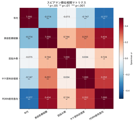 相関分析の結果、美容医療経験×PDRN使用意向のスピアマン順位相関はρ=.434(p<.001)で、全変数中最も強い正の相関を示しました。また、美容医療・年代を除外したロジスティック回帰では、浸透スキンケア使用がオッズ比(OR)3.6~5.2で最大の予測因子となりました。