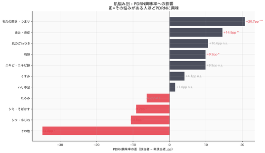 一方、シワ・小じわ悩みはPDRN興味率と負の関連(-10.6pp, p=.031)を示しました。これはシワ悩みが高年齢層に集中し、この層のPDRN認知自体が低いことが背景にあると考えられます。