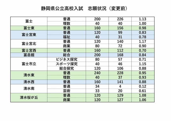 富士・富士東・富士宮東・富士宮北・富士宮西・富岳館・富士市立・清水東・清水西・清水南・清水桜が丘の志願状況は以下の通り。