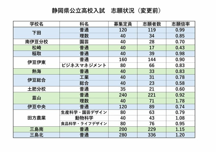 下田・南伊豆分校・松崎・稲取・伊豆伊東・熱海・伊豆総合・土肥分校・韮山・伊豆中央・田方農業・三島南・三島北の志願状況は以下の通り。