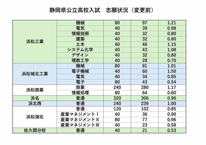 浜松工業・浜松城北工業・浜松商業・浜名・浜北西・浜松湖北・佐久間分校の志願状況は以下の通り。