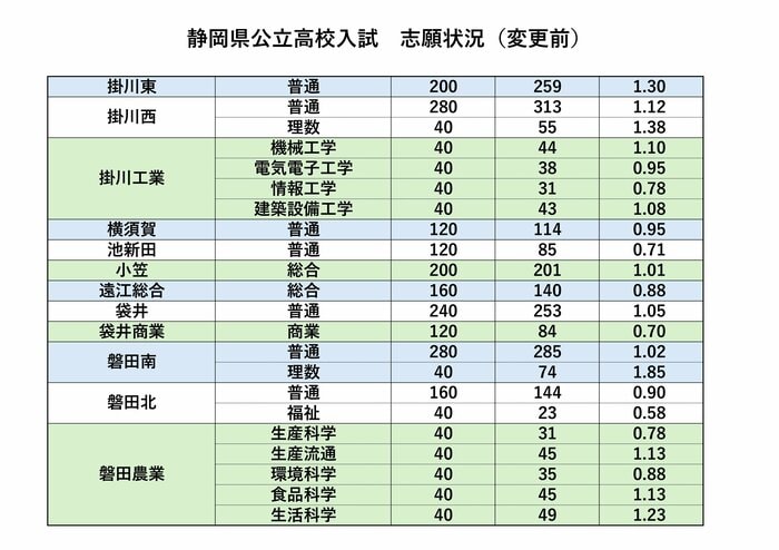 掛川東・掛川西・掛川工業・横須賀・池新田・小笠・遠江総合・袋井・袋井商業・磐田南・磐田北・磐田農業の志願状況は以下の通り。