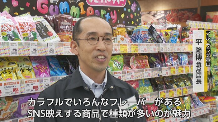 「ハード系のグミが好き」というアル・プラザ富山の平隆博食品店長に話を聞くと「カラフルでいろんなフレーバーがある。SNS映えする商品で種類が多いのが魅力」と、グミの人気の秘密を語ってくれた。