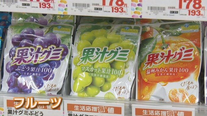 王道の果汁たっぷりグミに、もっちり柔らか系、噛みごたえ抜群のハード系グミなど、あるスーパーではおよそ160種類ものグミが並んでいた。グミ市場は2022年から急速に伸び、3年間でおよそ1.8倍に成長したという。