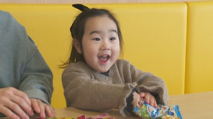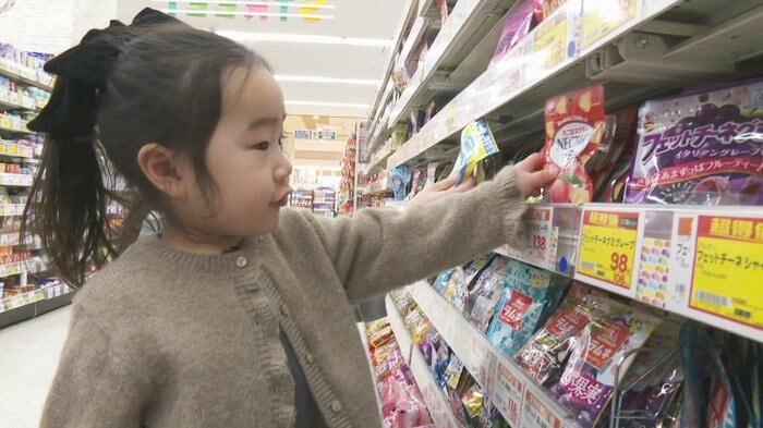 売り場で親子でお気に入りのグミを選んでいたのは母親の道場麗さんと3歳7か月の娘・翠ちゃん。麗さんは「手軽に食べられて満腹感も味わえてハッピーになれます」と笑顔で話す。