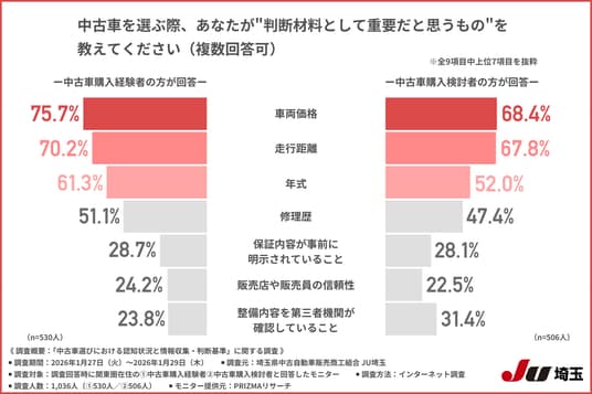 「中古車を選ぶ際、あなたが“判断材料として重要だと思うもの”」について尋ねたところ、中古車購入経験者は『車両価格(75.7%)』『走行距離(70.2%)』『年式(61.3%)』が上位になりました。