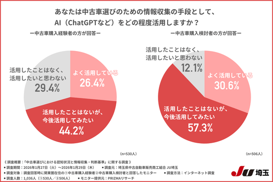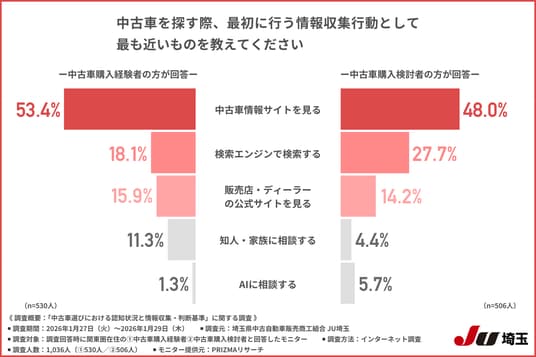 埼玉県中古自動車販売商工組合 JU埼玉(所在地:埼玉県さいたま市、会長・理事長:高橋 光晴)は、関東圏在住の1.中古車購入経験者2.中古車購入検討者を対象に、「中古車選びにおける認知状況と情報収集・判断基準」に関する調査を行いました。
