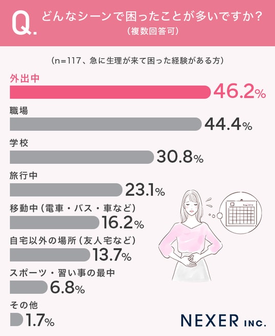 やはり自宅から離れているほど、急な生理への対応は難しくなりやすいようです。