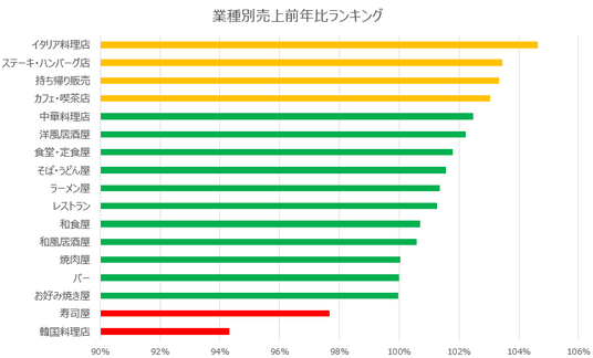 - 苦戦ワースト:韓国料理店94%、寿司屋98%、お好み焼き・バー・焼肉100%