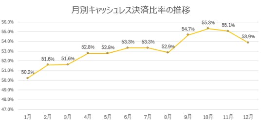 ・ 12月:キャッシュレス53.9%(年末の現金回帰)