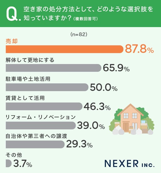 その結果「売却」が87.8%と最も多く、圧倒的な認知度を誇りました。続いて「解体して更地にする」が65.9%、「駐車場や土地活用」が50.0%、「賃貸として活用」が46.3%、「リフォーム・リノベーション」が39.0%という結果になっています。