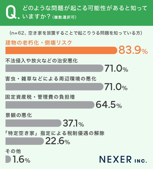 最も多かったのは「建物の老朽化・倒壊リスク」で83.9%でした。次いで「不法侵入や放火などの治安悪化」と「害虫・雑草などによる周辺環境の悪化」がともに71.0%、「固定資産税・管理費の負担増」が64.5%と続きました。