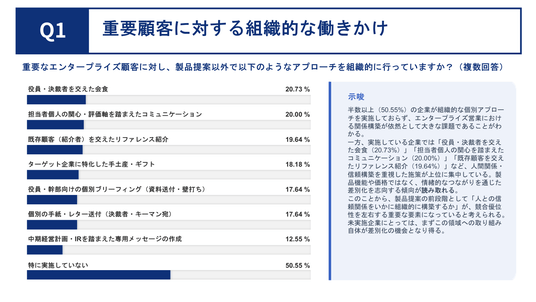 重要なエンタープライズ顧客に対し、製品提案以外で組織的な個別アプローチを行っているかを聞いたところ、「特に実施していない」が50.55% と過半数を占めました。