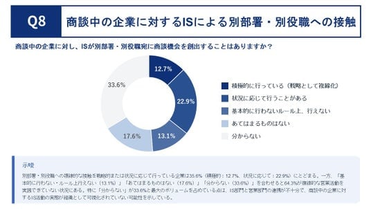 戦略的または状況に応じて行っている企業は35.6%にとどまり、特に「分からない」が33.6%と最大を占めている点は、IS部門と営業部門の連携が不十分で、商談中企業へのIS活動の実態が組織として可視化されていない可能性を示しています。