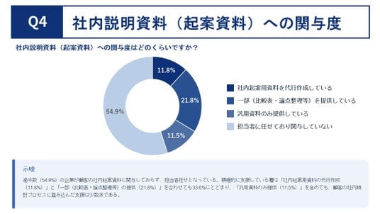 顧客の社内説明資料(起案資料)にどの程度関与しているかを聞いたところ、「担当者に任せており関与していない」が54.9% と過半数を占めました。