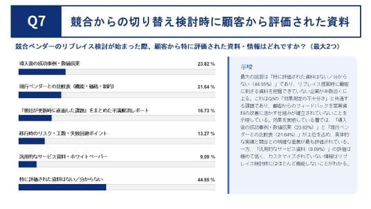 一方、「汎用的なサービス資料(9.09%)」の評価は極めて低く、カスタマイズされていない情報はリプレイス検討時にはほとんど機能しません。