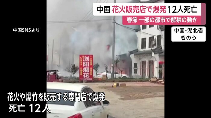 中国の国営新華社通信によると、湖北省できのう、花火や爆竹を販売する専門店で爆発があり、12人が死亡し、約50平方メートルが焼けた。