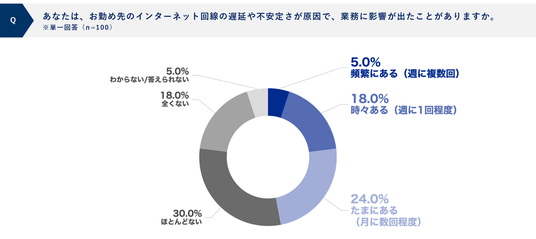 インターネット回線の遅延や不安定さが原因で「業務に影響が出た」という従業員は47.0%で、うち51.1%が「1日20分以上」の時間を無駄にしたと回答しました。業務への具体的な影響は「資料やファイルのダウンロードに時間がかかった」(42.6%)、「社内システムへのアクセスが遅い」(40.4%)等を挙げ、回線遅延や不安定により“見えない損失”が頻繁に発生していることが明らかになりました。