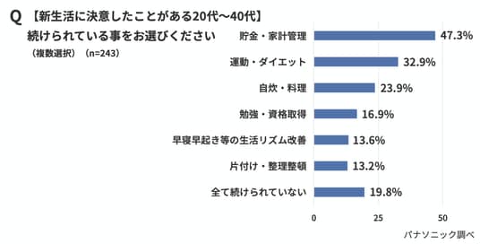 春の新生活は、「今年こそ○○を続けよう」と生活を立て直したくなるタイミングですが、続かない人も多いのではないでしょうか。そこでパナソニック株式会社は、20歳以上の一人暮らし男女600人を対象に、「新生活の決意」に関する調査を実施しました。
