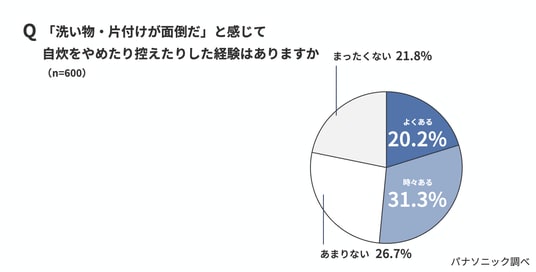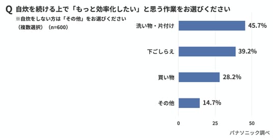 「洗い物・片付けが面倒だと感じて、自炊をやめたり控えたりした経験があるか」という質問には、「よくある」と「時々ある」が合計51.5%を占めており、半数以上が“洗い物のことを考えて自炊をセーブしたことがある”と答えている。また、自炊を続けるうえで「もっと効率化したい」と思う作業では、「洗い物・片付け」(45.7%)が最多に。