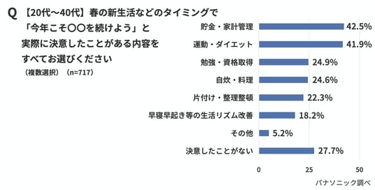 春の新生活に決意したことを尋ねると、「貯金・家計管理」と「運動・ダイエット」がいずれも40%超で新生活に向けた人気ツートップ。一方で「決意したことはない」人も27.7%という結果に。