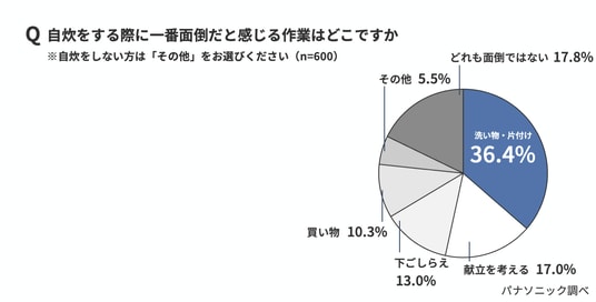 自炊をする際に一番面倒だと感じる作業を尋ねると、「洗い物・片付け」が36.3%でトップとなり、「献立を考える」(17.0%)や「買い物」(10.3%)を大きく上回った。