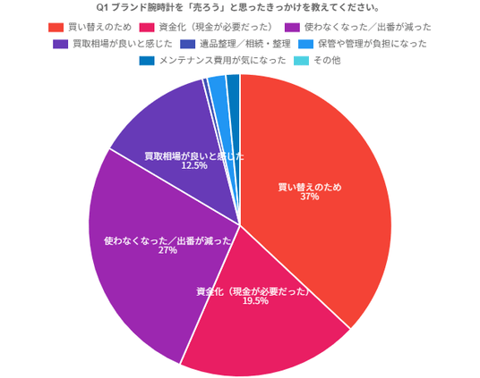最多は「買い替えのため」(37%)。次いで「使わなくなった/出番が減った」(27%)が続き、買い替えニーズや利用頻度の低下が売却の主要因であることが分かります。さらに「資金化(現金が必要だった)」(19.5%)が3番目となり、時計が“必要なときに現金化できる資産”として捉えられている実態も示されました。
