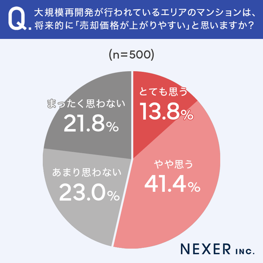まず、大規模再開発が行われているエリアのマンションについて、将来的に売却価格が上がりやすいと思うかを聞いてみました。