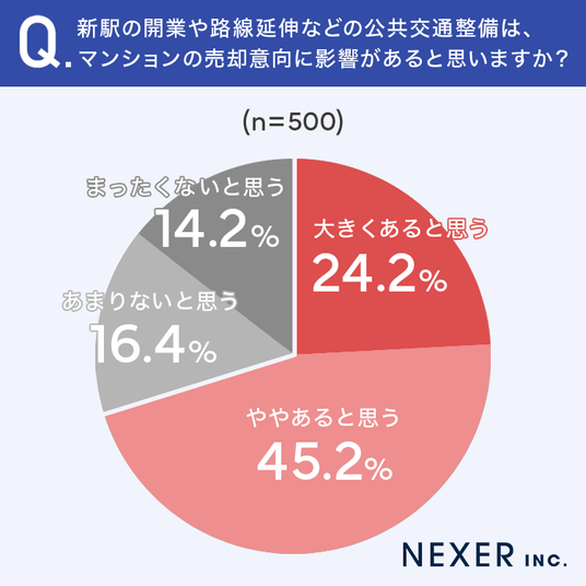 続いて、新駅の開業や路線延伸などの公共交通整備が、マンションの売却意向に影響すると思うかを聞いてみました。