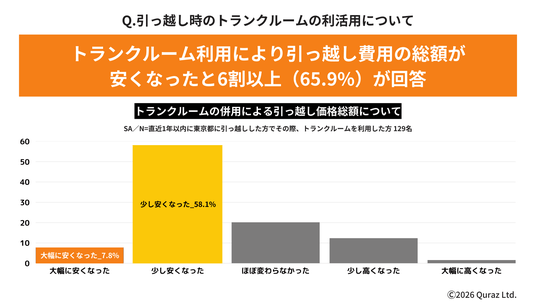 ●直近1年以内に東京都へ引っ越しを行った方の約3割(29.3%)が分散・二段階引っ越しにトランクルームを利用。利用者の6割以上(65.9%)が費用削減を実感しており、価格高騰が続く中で無料シャトル等の運搬機能を備えたトランクルーム活用が選択肢として広がりつつあることががうかがえる。
